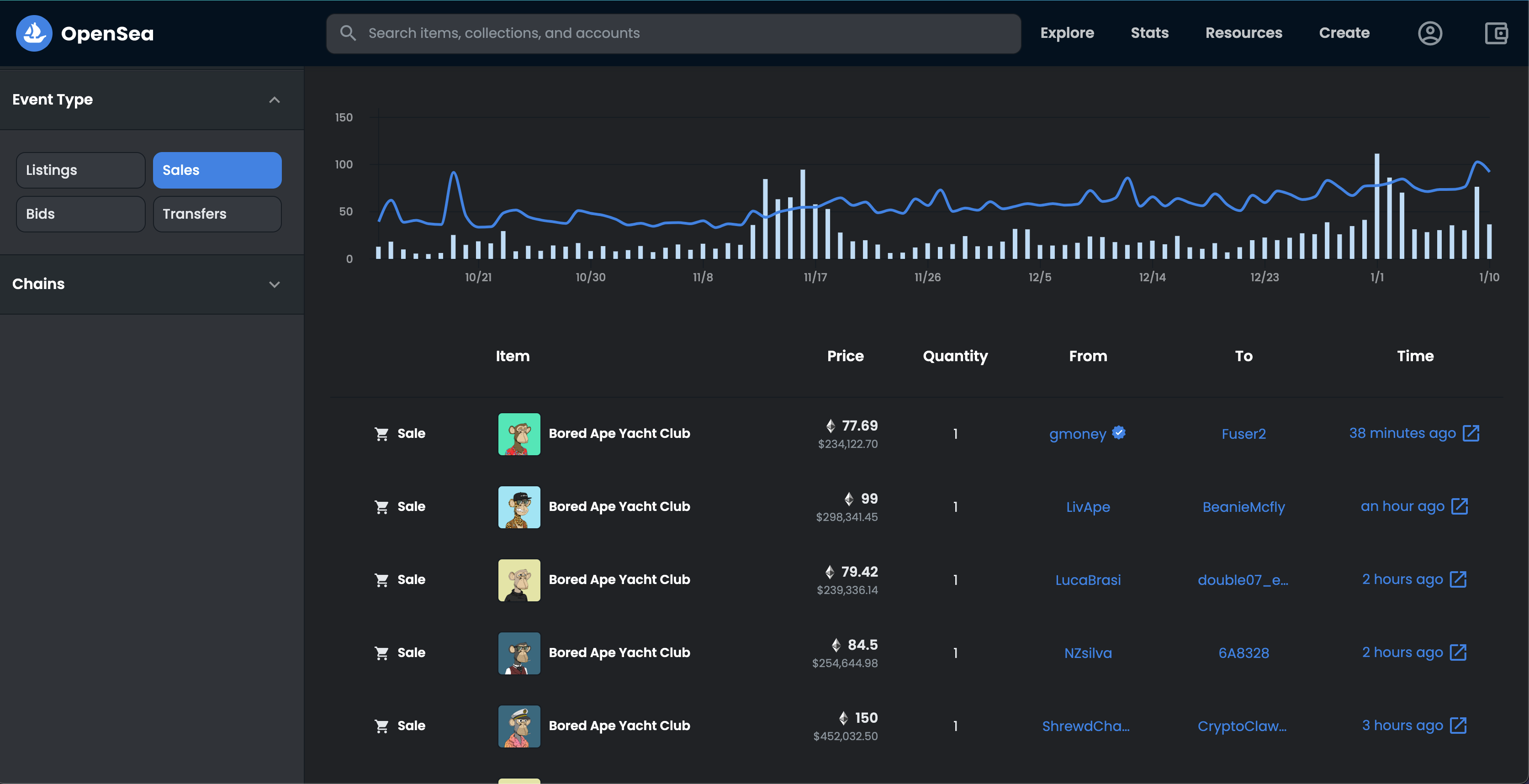 You may think who is that crazy to buy such nonsense arts. But if you go to the activity tab standing beside the Items tab on opensea platform for Bored Ape Yacht Club NFT you can check the recent activities. Like as of my time you can the below image: